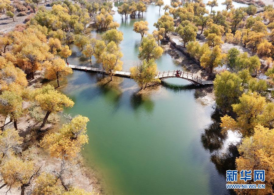 10月16日無人機(jī)拍攝的內(nèi)蒙古阿拉善盟額濟(jì)納旗境內(nèi)的胡楊林。新華社記者彭源攝