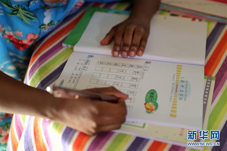 9月25日,在美國(guó)芝加哥,卡亞·恩朱比練習(xí)寫漢字。 新華社記者 汪平 攝
