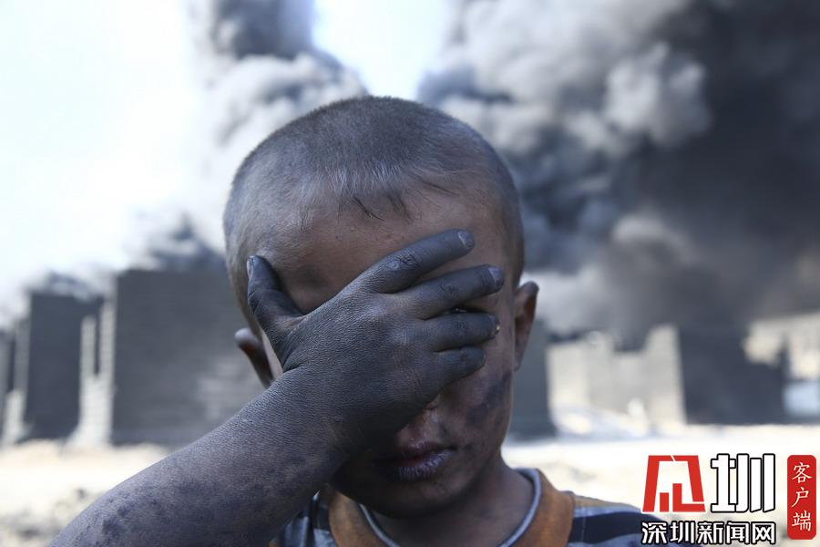 當?shù)貢r間2016年10月25日,伊拉克摩蘇爾,遭伊斯蘭國縱火的油井冒出濃濃黑煙,嚴重影響了鎮(zhèn)子里的生活,孩子們的手和臉都被熏黑了。伊拉克政府軍于10月16日正式展開收復(fù)摩蘇爾的戰(zhàn)役。