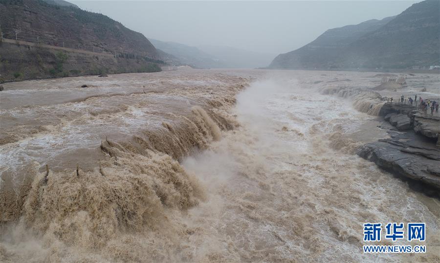 受近日降雨影響,位于山西吉縣的壺口瀑布水量增大,壯美的瀑布群景觀吸引眾多游客前來觀賞。新華社記者楊晨光攝