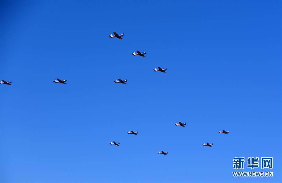 10月17日,“天之翼”飛行表演隊(duì)進(jìn)行飛行表演。 當(dāng)日,慶祝人民空軍成立70周年航空開放活動在吉林長春開幕??哲姸嘀эw行表演隊(duì)、跳傘表演隊(duì)共舞藍(lán)天,殲-20、運(yùn)-20、殲-16等多款主力戰(zhàn)機(jī)展翅蒼穹,空降兵和航空兵作戰(zhàn)部隊(duì)派出精銳力量展示作戰(zhàn)對抗,多型武器裝備大規(guī)模、全系統(tǒng)抵臨現(xiàn)場。人民空軍以前所未有的強(qiáng)大陣容亮相長春,頌揚(yáng)中國航空事業(yè)110年發(fā)展成就,以開放、自信的姿態(tài)為即將到來的人民空軍70華誕獻(xiàn)上大禮。 新華社記者 張楠 攝