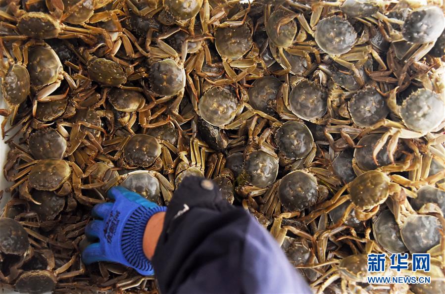 10月17日,東營市惠澤農業(yè)科技有限公司黃河口大閘蟹養(yǎng)殖區(qū)的工人在撿拾大閘蟹進行稱重。新華社記者 王凱 攝