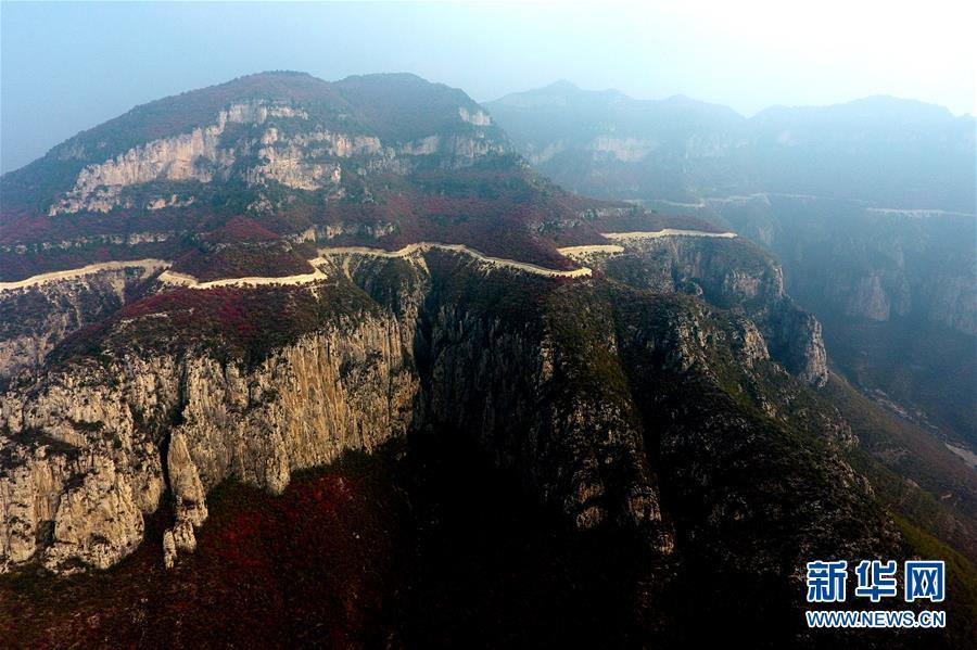 這是10月19日無人機(jī)拍攝的河北省涉縣太行紅葉大峽谷景色。新華社記者王曉攝