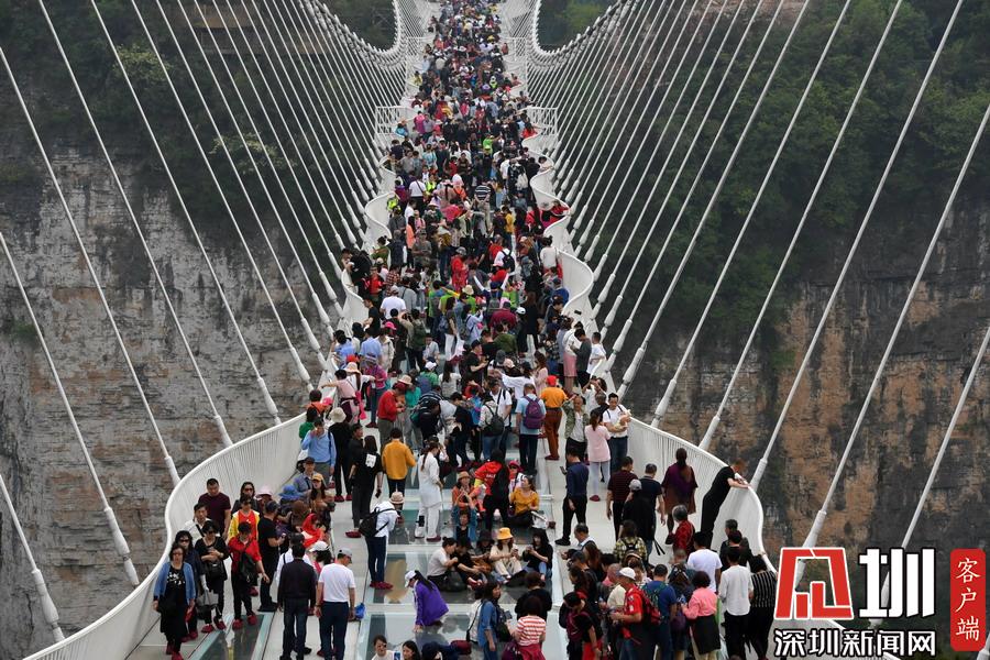 2018年10月4日,游客正在參觀湖南省湘西土家族苗族自治州吉首市矮寨景區(qū)懸崖棧道。劉振軍/視覺中國