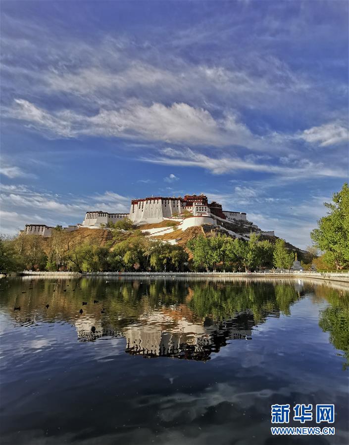 6月5日拍攝的藍天白云和綠水之間的布達拉宮。