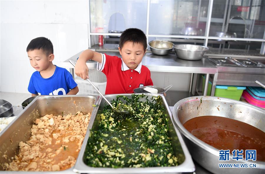 9月3日,金寨縣希望小學學生在盛午飯。新華社記者張端攝