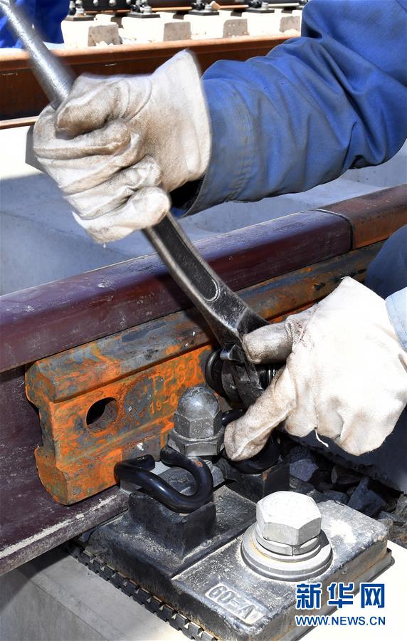 6月6日,負(fù)責(zé)鋪軌的中鐵十一局集團的建設(shè)者在現(xiàn)場作業(yè)。新華社記者李鑫攝