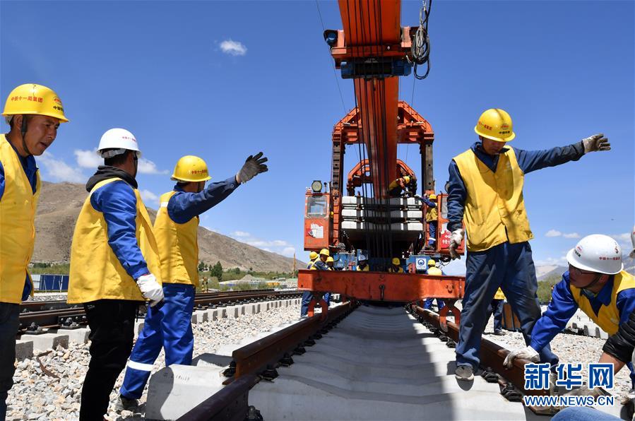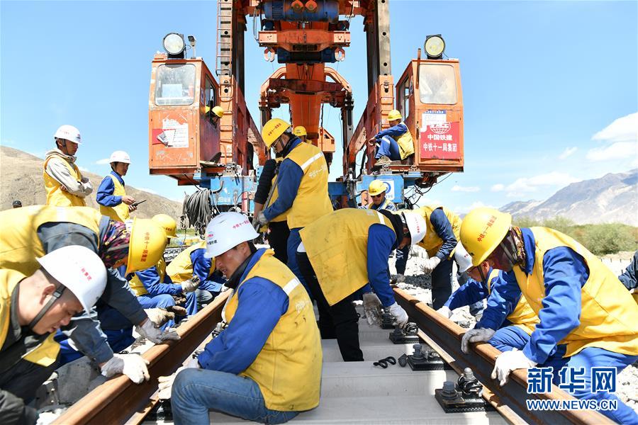 6月6日,負(fù)責(zé)鋪軌的中鐵十一局集團的建設(shè)者在現(xiàn)場作業(yè)。新華社記者普布扎西攝