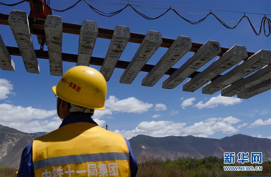 6月6日,負(fù)責(zé)鋪軌的中鐵十一局集團(tuán)的建設(shè)者在現(xiàn)場(chǎng)作業(yè)。新華社記者普布扎西攝