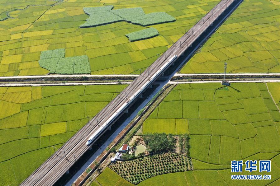 10月29日,列車從廣西賓陽縣古辣鎮(zhèn)豐收的稻田間駛過(無人機拍攝)。新華社記者陸波岸攝