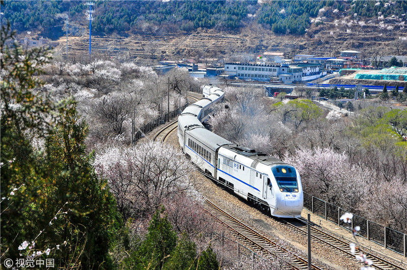 2019年3月22日,北京居庸關(guān)附近的山花盛開,S2線列車穿行在花海之中,構(gòu)成一幅美麗的畫面。