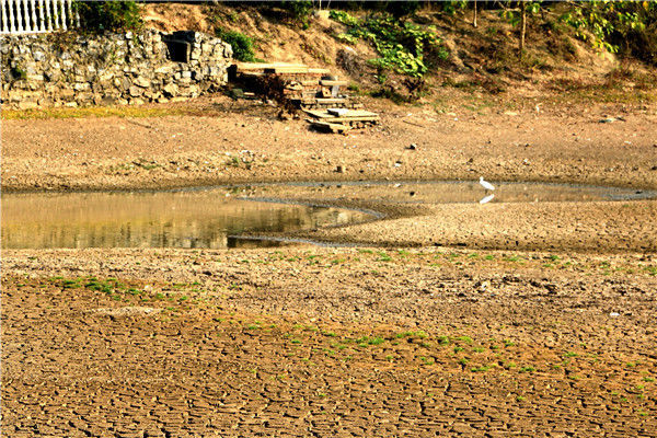 2019年10月4日,江西彭澤縣黃嶺鄉(xiāng)芳湖村,池塘干枯見底。圖為一只蒼鷺在干枯的池塘覓水。