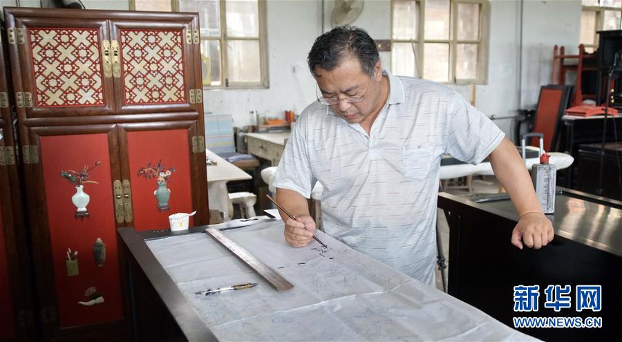 北京金漆鑲嵌有限責(zé)任公司工藝美術(shù)大師胡昕在創(chuàng)作漆畫屏風(fēng)(9月19日攝)。新華社記者李欣攝