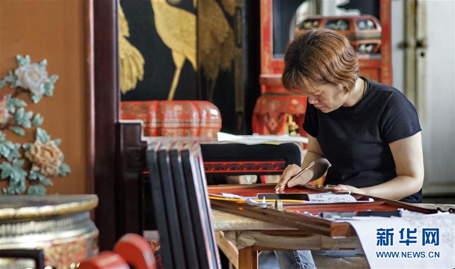 北京金漆鑲嵌有限責任公司技師在創(chuàng)作漆畫(10月31日攝)。新華社記者李欣攝