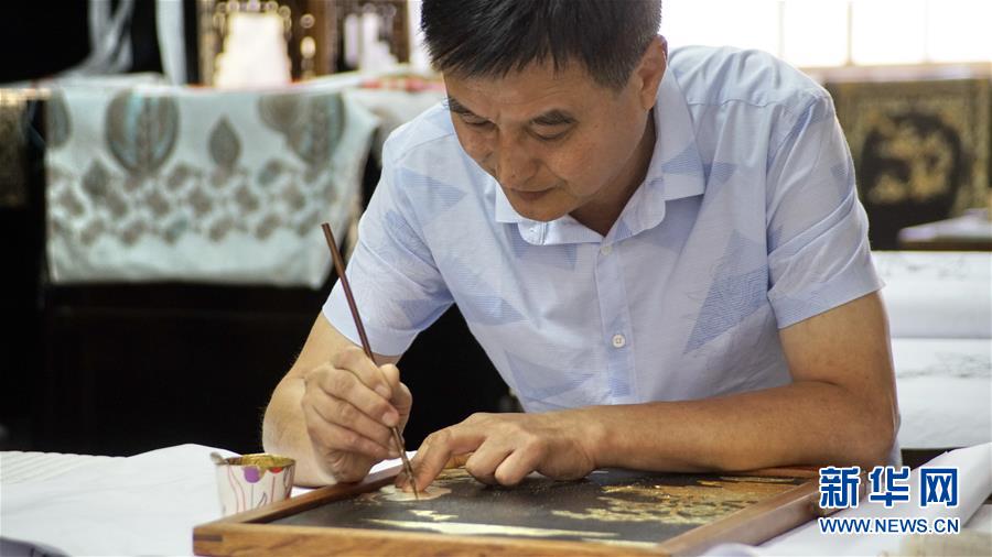 北京金漆鑲嵌有限責(zé)任公司工藝美術(shù)大師敖明在創(chuàng)作描金漆畫(10月31日攝)。新華社記者李欣攝