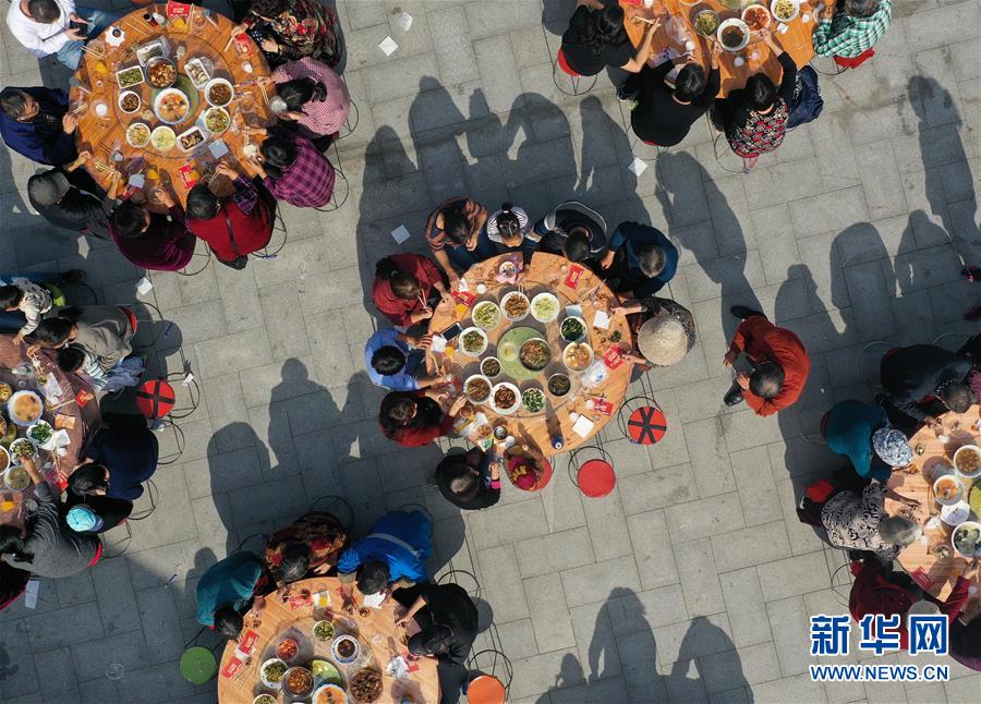 11月2日,南京仙林街道仙林新村社區(qū)居民參加千家宴(無(wú)人機(jī)拍攝)。 新華社記者 季春鵬 攝