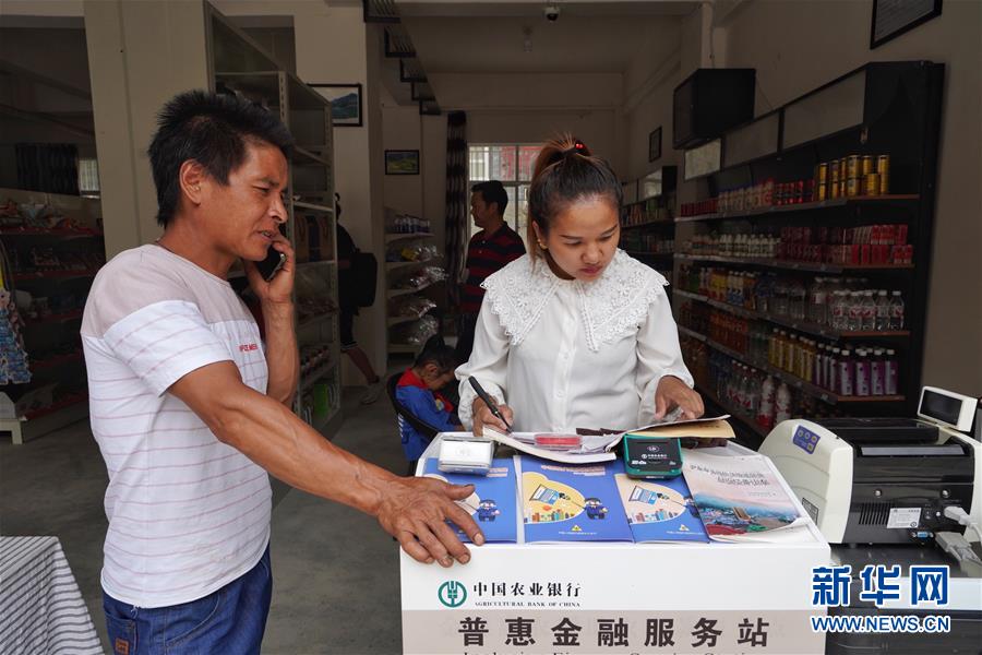 在大興地鎮(zhèn)維拉壩“珠海小區(qū)”金融服務站,姬紅花(右)幫助村民提取現(xiàn)金(6月24日攝)。新華社記者秦晴攝