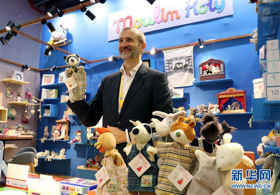 11月5日,在第二屆進(jìn)博會(huì)品質(zhì)生活展區(qū),來自法國的玩具品牌展商手持兒童手偶玩具。新華社記者劉穎攝