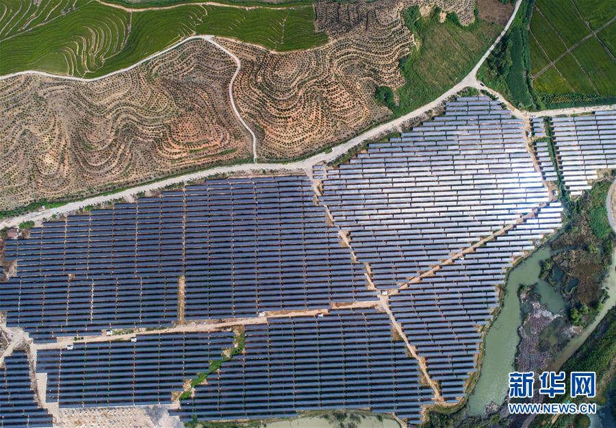 空中俯瞰湖州市埭溪鎮(zhèn)東紅村的光伏發(fā)電站(9月26日無人機(jī)拍攝)。該光伏電站占地2500多畝,是當(dāng)?shù)貜U棄礦坑通過改造建成的“農(nóng)光互補(bǔ)”光伏發(fā)電站。