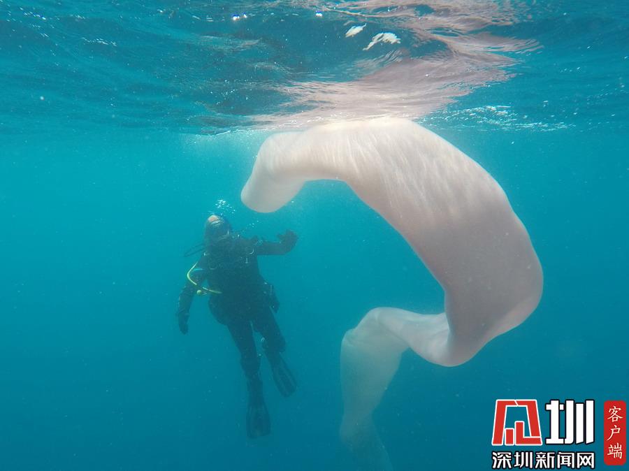 2018年11月13日報(bào)道,10月25日,潛水員Andrew Buttle和好友Steve Hathaway來到新西蘭最活躍火山之一的懷特島附近海域潛水,正當(dāng)他們在海中潛游之時,突然發(fā)現(xiàn)遠(yuǎn)處出現(xiàn)了一條巨大的白帶,在海水中搖曳生姿,仿若一個鼓鼓的風(fēng)向袋。帶著好奇心,Andrew和Steve慢慢靠近這個神秘的東西,仔細(xì)一看,發(fā)現(xiàn)這并非什么白色綢帶,也不是風(fēng)向袋,而是一條碩大的蛀船蟲,這個神奇的海洋軟體生物長達(dá)整整8米多,上面附著著成千上萬個有機(jī)體,模樣十分駭人。