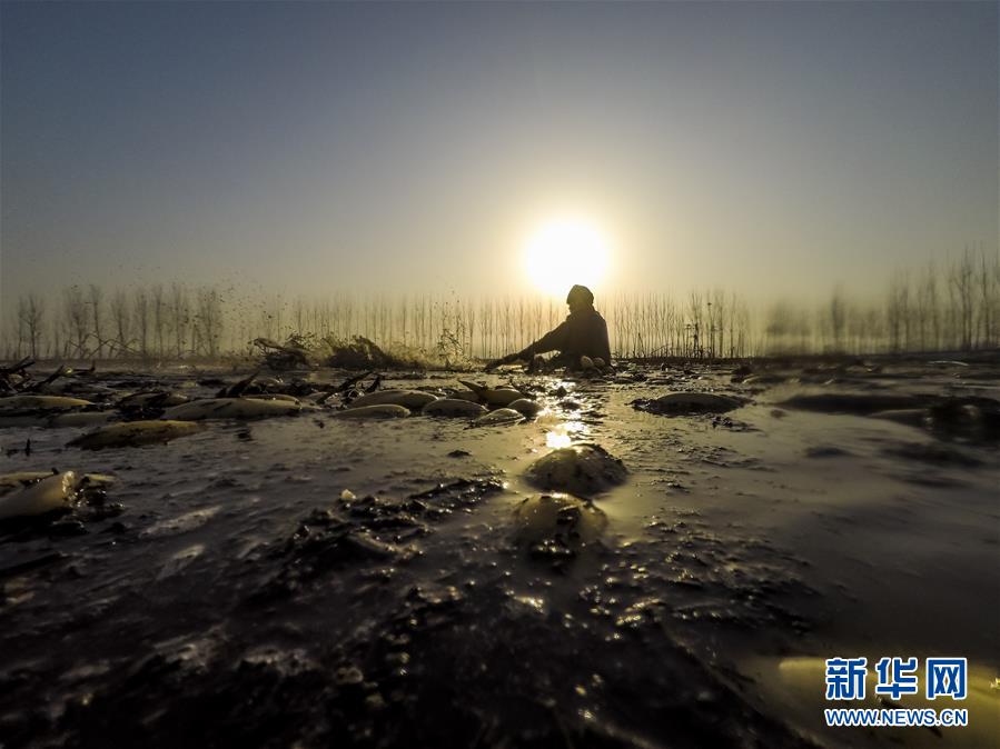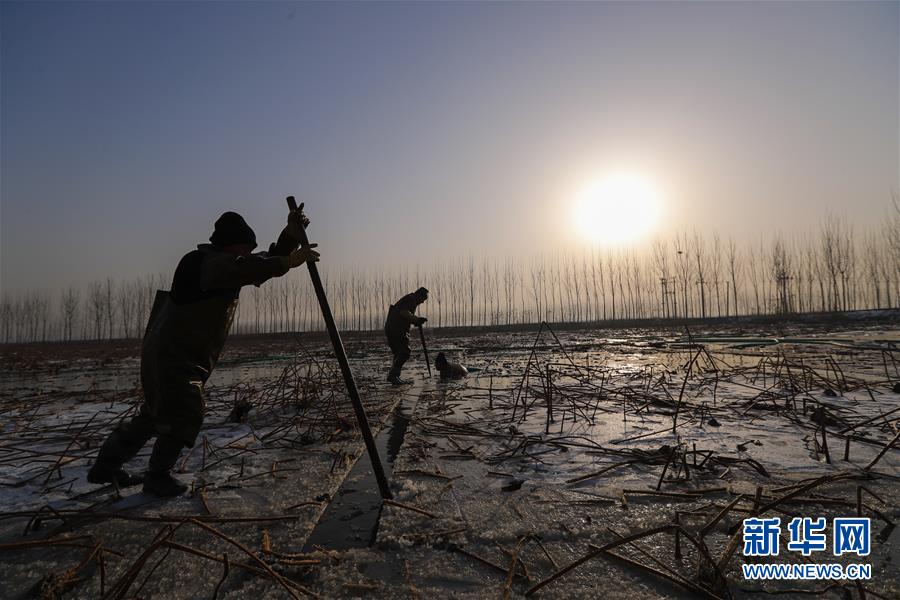 11月18日,工人在采收蓮藕。初冬時節(jié),河北省唐山市曹妃甸蓮藕豐收,工人們在結冰之前忙著采收蓮藕。新華社記者邢廣利攝