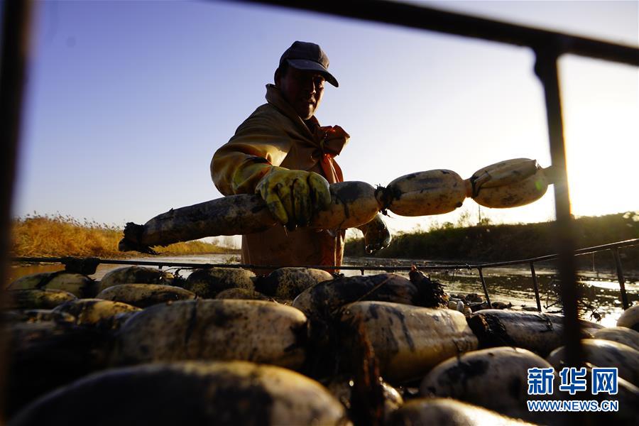 11月18日,工人在采收蓮藕。初冬時節(jié),河北省唐山市曹妃甸蓮藕豐收,工人們在結冰之前忙著采收蓮藕。新華社記者楊世堯攝