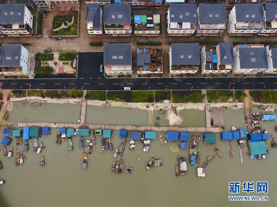 在寧德福安市溪邳村,一艘漁船經(jīng)過岸上新居(3月8日無人機拍攝)。新華社記者姜克紅攝