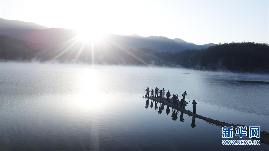 11月14日,游客在奇墅湖邊拍照(無人機拍攝)。新華社記者張端攝