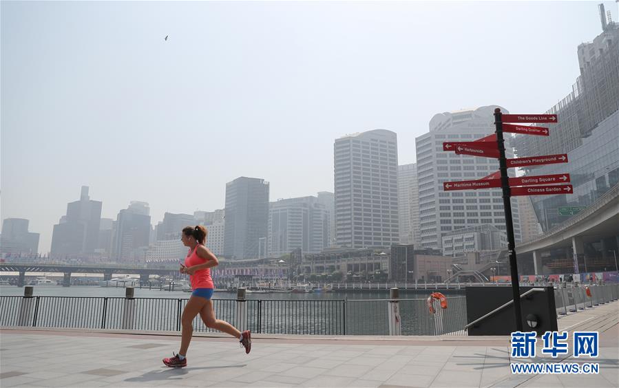 11月21日,在濃煙籠罩下的澳大利亞悉尼達令港,一名女子在港口步道上跑步。澳大利亞東部近期林火肆虐,悉尼所在的新南威爾士州自進入今年林火季以來,過火面積超過100萬公頃。林火造成悉尼濃煙圍城,市民生活受到影響。新華社記者白雪飛攝