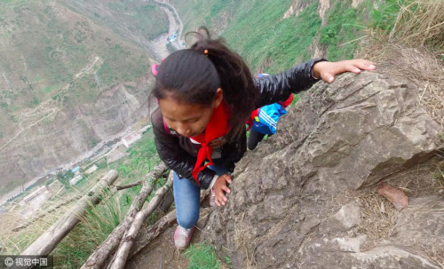 上學的孩子都背著沉沉的書包,大多數(shù)是女孩,15個孩子在三個家長的保護下,大約用了2個小時,到達“懸崖村”。上山容易下山難,遇到雨雪天氣,村里人就不再外出了。圖片來源:視覺中國