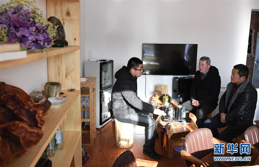 11月24日,在新疆吉木乃縣草原石城景區(qū)附近的吉木乃縣托斯特鄉(xiāng)塔斯特村,鄉(xiāng)黨委書記王繼江(左)與村民一起討論冬季游客接待事宜。新華社記者沙達(dá)提攝