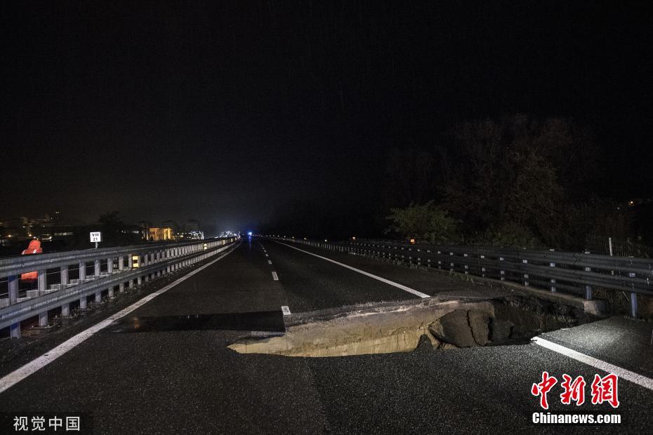 當(dāng)?shù)貢r(shí)間2019年11月24日,意大利Villafranca dAsti,意大利遭受惡劣天氣和持續(xù)多日的暴雨,通往都靈方向的A21高速公路路面出現(xiàn)“大坑”。圖片來(lái)源:視覺(jué)中國(guó)