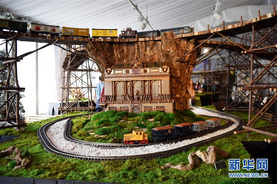 11月26日,在美國紐約植物園節(jié)日小火車展上,模型小火車駛過紐約中央車站微縮模型。新華社記者韓芳攝