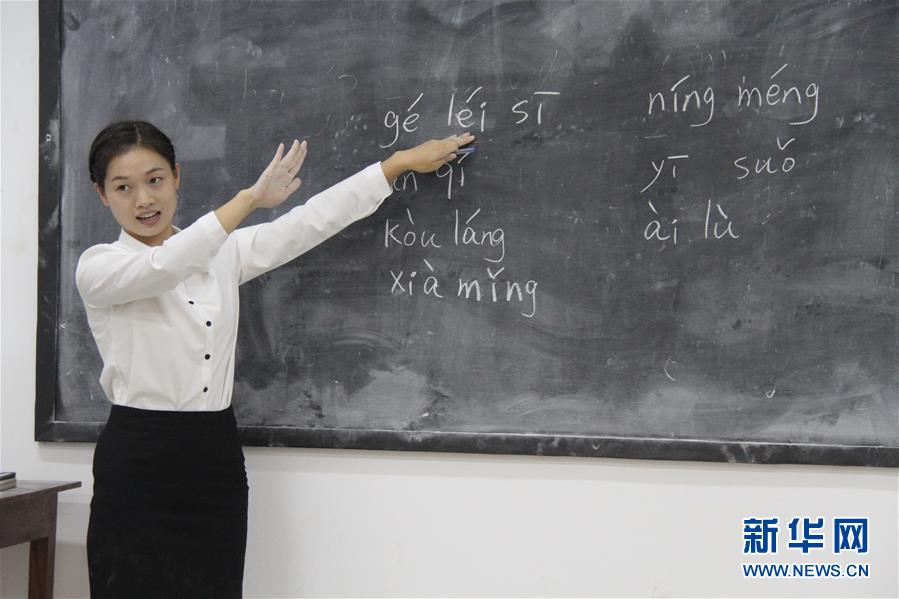 11月18日,在多哥首都洛美,中國老師文盼在第一堂中文課上講習(xí)拼音。新華社記者肖玖陽攝
