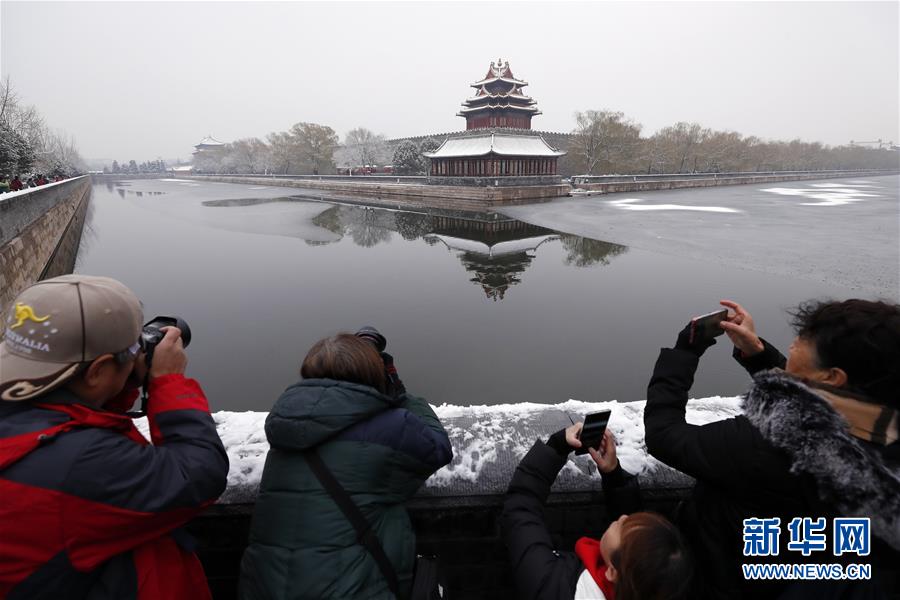 11月30日,人們在雪后的故宮角樓附近拍照。 新華社記者 沈伯韓 攝