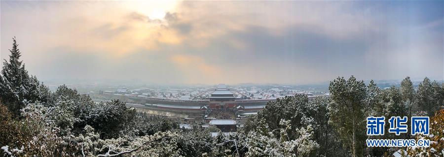 這是11月30日在北京景山公園萬春亭拍攝的雪后故宮(手機(jī)全景模式拍攝)。 新華社記者 沈伯韓 攝