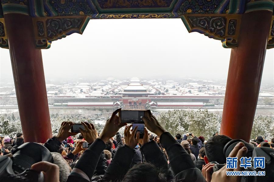 11月30日,人們在北京景山公園的萬春亭拍攝雪后的故宮。 新華社記者 沈伯韓 攝