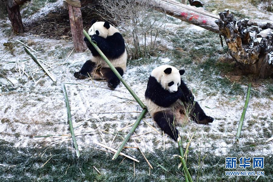11月29日,在西寧熊貓館內(nèi),兩只大熊貓?jiān)诔灾褡印?當(dāng)日,青海省西寧市迎來降雪,西寧熊貓館四只“萌寵”大熊貓?jiān)谘┨炖锵硎苤灾褡拥臉啡ぁ?jù)了解,大熊貓生活的適宜溫度在26攝氏度至零下5攝氏度之間,冬季氣溫低于零下5攝氏度時(shí),場(chǎng)館會(huì)啟用保暖設(shè)施。 新華社記者 吳剛 攝