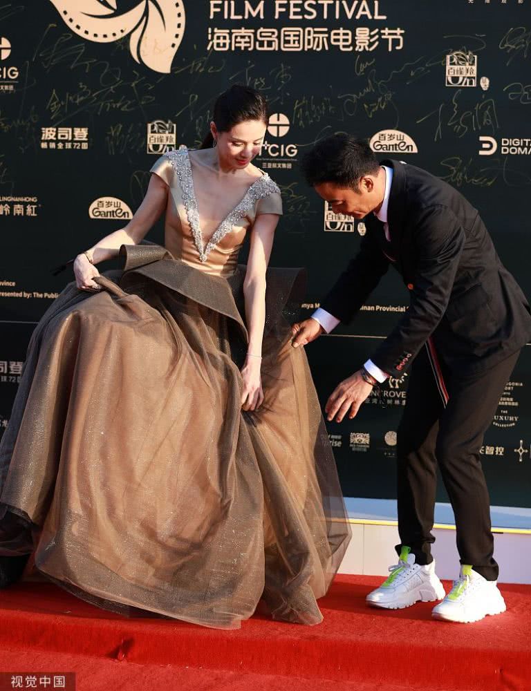 任達華為李若彤整理裙擺。
