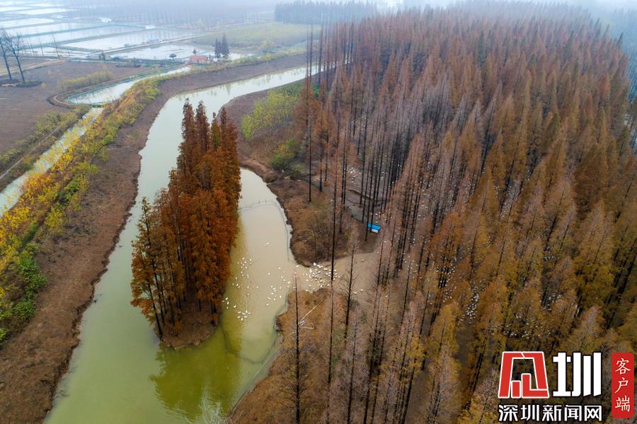 2019年12月1日,江蘇省宿遷市泗洪縣,航拍5000多只四季鵝在陳?ài)琢謭?chǎng)的樹(shù)林下吃食的壯觀場(chǎng)景。