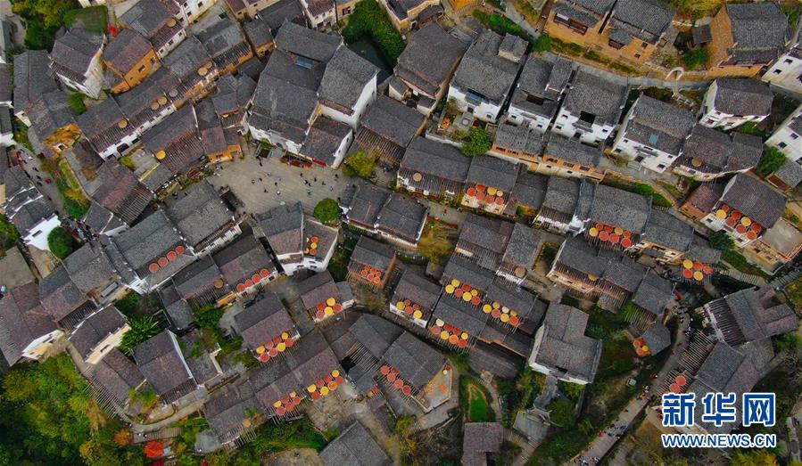 這是婺源縣江灣鎮(zhèn)篁嶺村的曬秋景象(11月7日無人機拍攝)。新華社記者胡晨歡攝