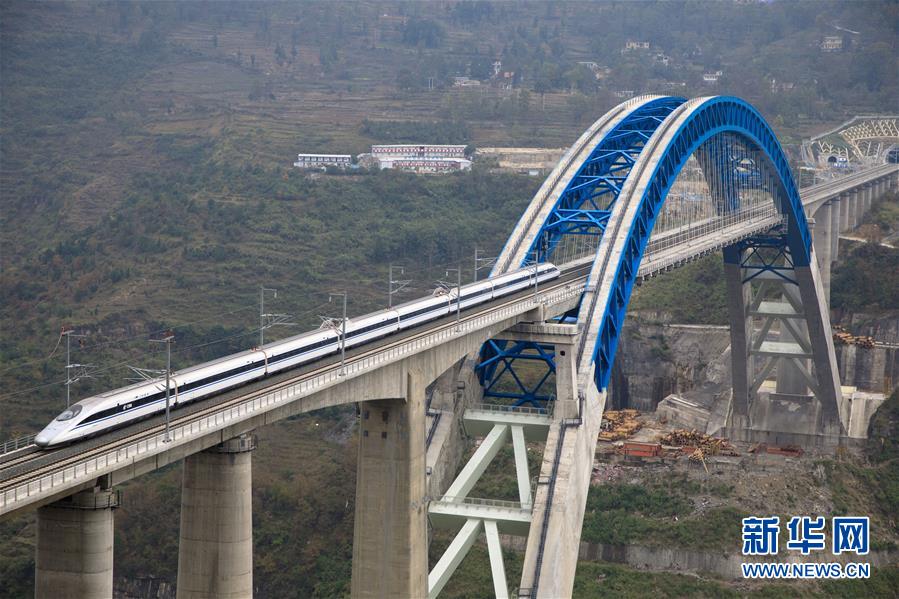 12月2日,一輛試驗列車駛過成貴高鐵鴨池河特大橋。