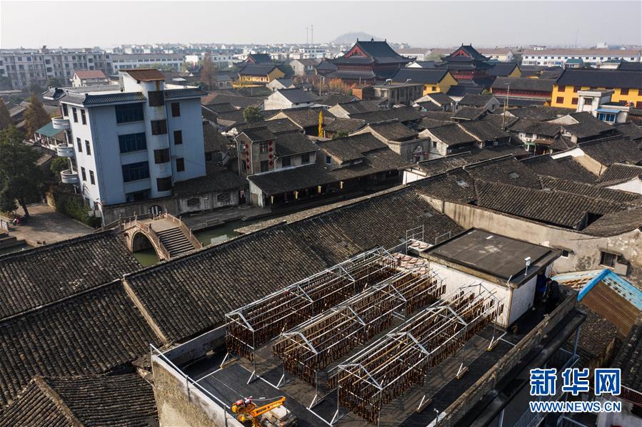 12月3日,安昌古鎮(zhèn)傳統(tǒng)臘味作坊里曬滿了各種手工制作的紹興臘味(無人機(jī)拍攝)。新華社記者徐昱攝