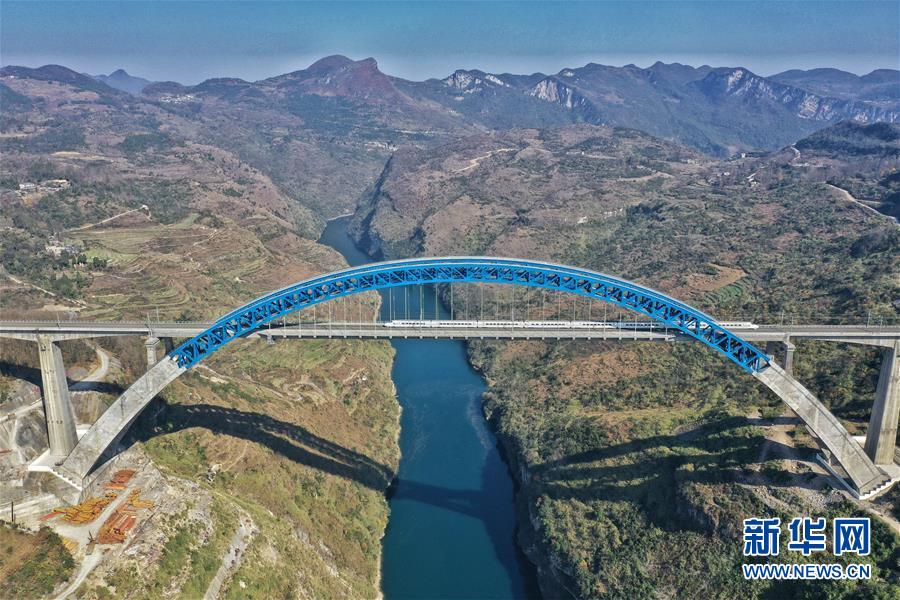 12月16日,一列動(dòng)車(chē)組列車(chē)從成貴高鐵鴨池河特大橋上駛過(guò)(無(wú)人機(jī)拍攝)。新華社記者歐東衢攝