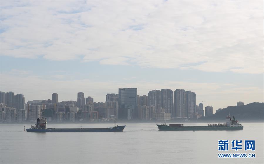 在澳門友誼大橋附近海域,兩艘船相向而行(12月17日拍攝)。新華社記者李鋼攝
