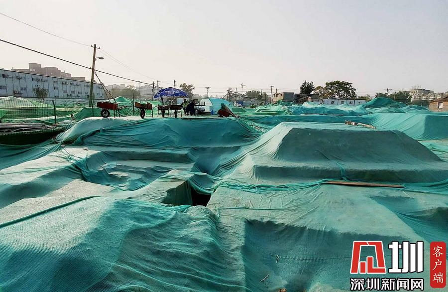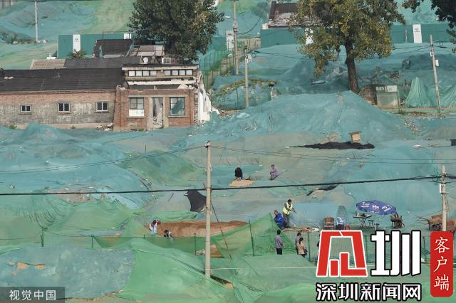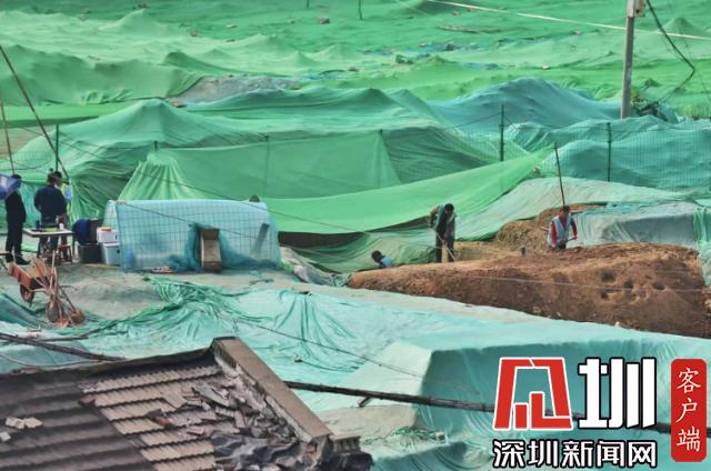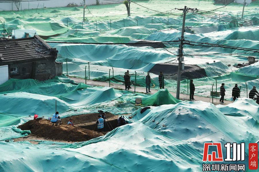 圍擋內(nèi),工地大部分被綠色苫布覆蓋,只露出幾處規(guī)整的探坑??脊殴ぷ髡哒诰o張忙碌中,有些工作人員戴著草帽,坐在馬扎上記錄發(fā)掘細(xì)節(jié),還有一些穿著藍(lán)色背心的工作人員使用工具正在做清理工作。
