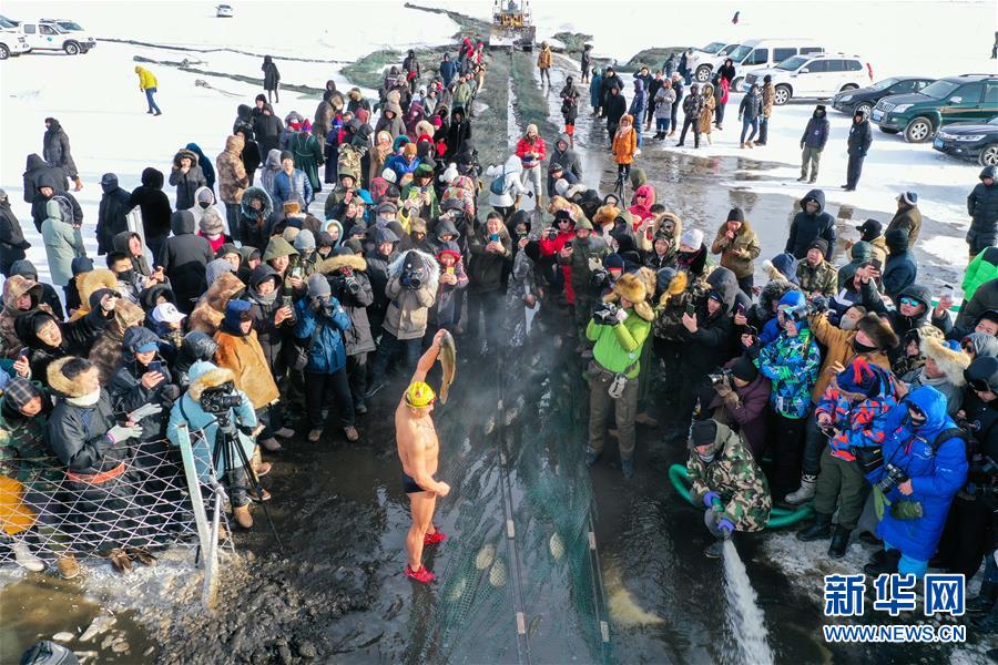 12月18日,一名冬泳愛(ài)好者展示冬捕魚(無(wú)人機(jī)拍攝)。 當(dāng)日,位于內(nèi)蒙古呼倫貝爾大草原上的諾干湖舉行冬捕活動(dòng),吸引不少游客前來(lái)觀看。冬日的諾干湖冰雪覆蓋,諾干湖冬捕也是當(dāng)?shù)囟韭糜蔚奶厣顒?dòng)之一。 新華社記者 劉磊 攝