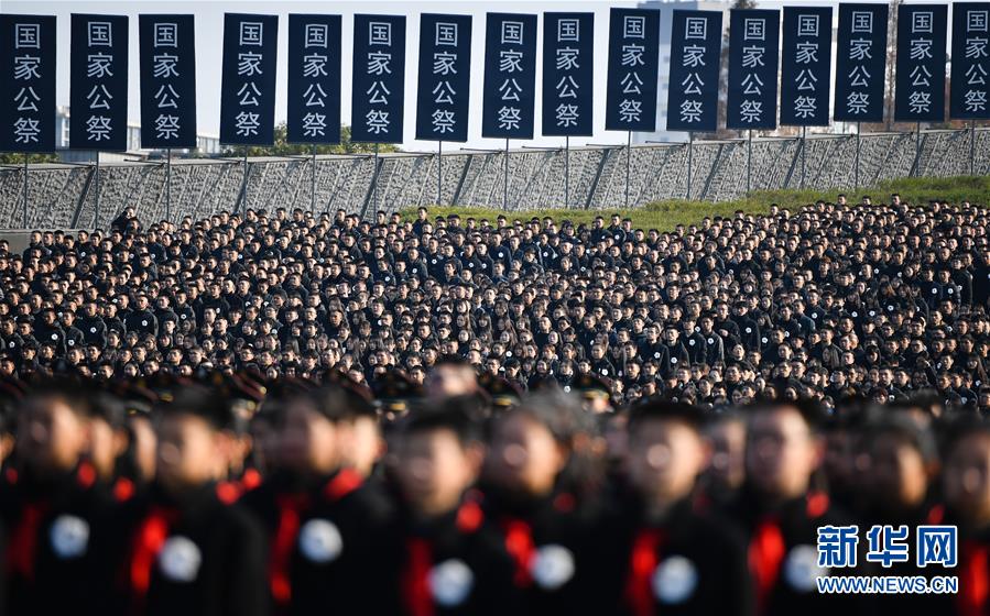 12月13日拍攝的南京大屠殺死難者國(guó)家公祭儀式現(xiàn)場(chǎng)。 當(dāng)日是第六個(gè)南京大屠殺死難者國(guó)家公祭日,南京大屠殺死難者國(guó)家公祭儀式在侵華日軍南京大屠殺遇難同胞紀(jì)念館舉行。 新華社記者 李響 攝