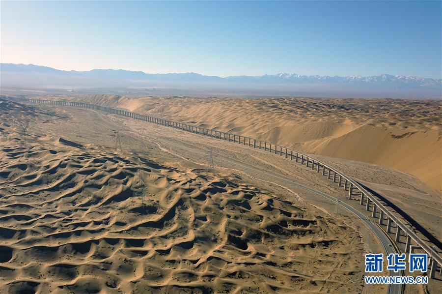 這是敦格鐵路沙山溝特大橋(12月11日無人機拍攝)。 敦(煌)格(爾木)鐵路沙山溝特大橋位于甘肅省酒泉市阿克塞哈薩克族自治縣境內的庫姆塔格沙漠內,是一座穿越活動性沙漠地區(qū)的特長橋梁,也是敦格鐵路的重難點控制工程。據介紹,橋梁所在區(qū)域風沙活動頻繁,四季及晝夜溫差大,在建設過程中,中鐵十一局集團有限公司的建設者根據沙層的厚度、分布及含水率的不同,總結出一套沙丘樁基施工工藝。 新華社記者 范培珅 攝