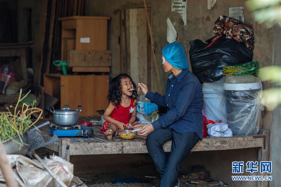 2019年3月15日,在柬埔寨磅湛,接受了白內(nèi)障手術(shù)的孫美樂回到住處給女兒喂飯。今年36歲的孫美樂是一位經(jīng)濟(jì)貧困的單身母親,和小女兒租住在一間簡(jiǎn)陋的小屋里。她的左眼因白內(nèi)障幾近失明,無法繼續(xù)工作。在中國(guó)醫(yī)生到磅湛開展義診期間,她接受了廣西醫(yī)科大學(xué)第一附屬醫(yī)院梁皓醫(yī)生實(shí)施的白內(nèi)障手術(shù),術(shù)后一天她的左眼即恢復(fù)視物。 新華社記者 朱煒 攝